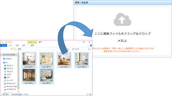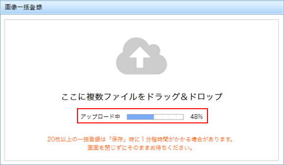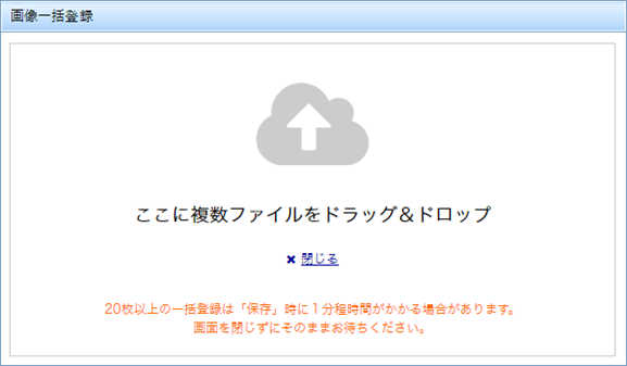 ②画像一括登録画面が表示されますので、登録する画像をドラッグ&ドロップしてください。