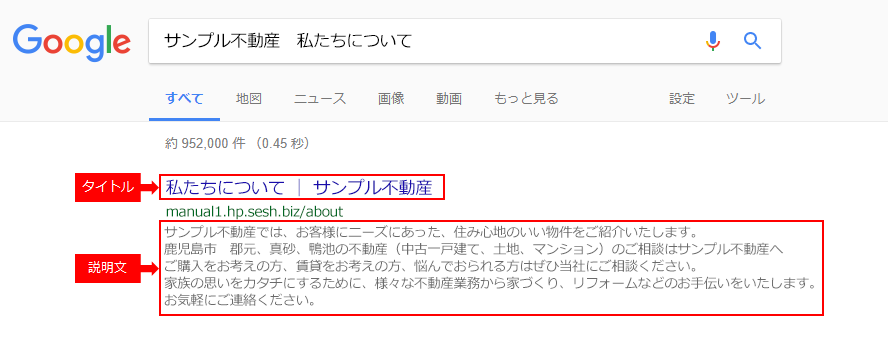 ページ説明に設定した文字は、GoogleやYahoo!で検索した際に表示される、ホームページの説明文として引用される文章です。