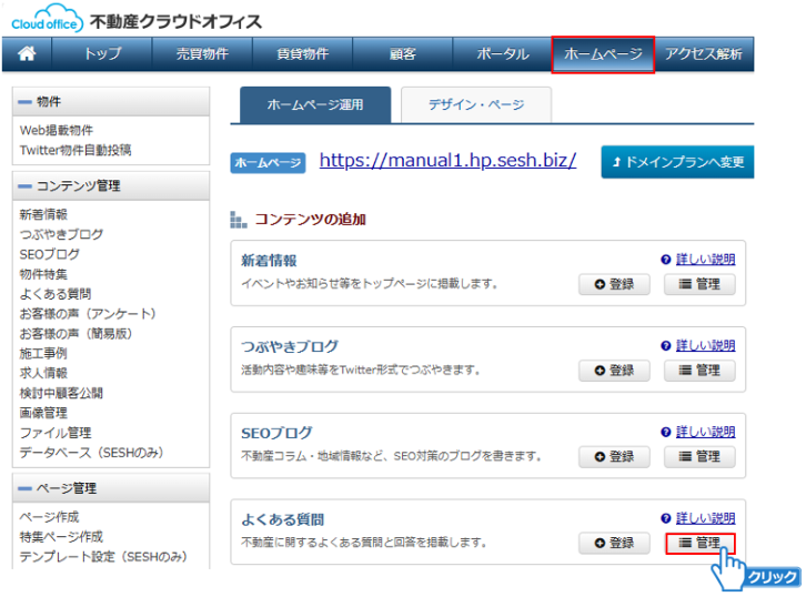 ①よくある質問内の「管理」ボタンをクリックしてください。