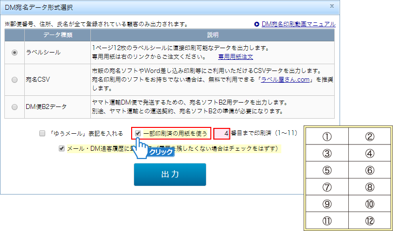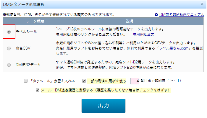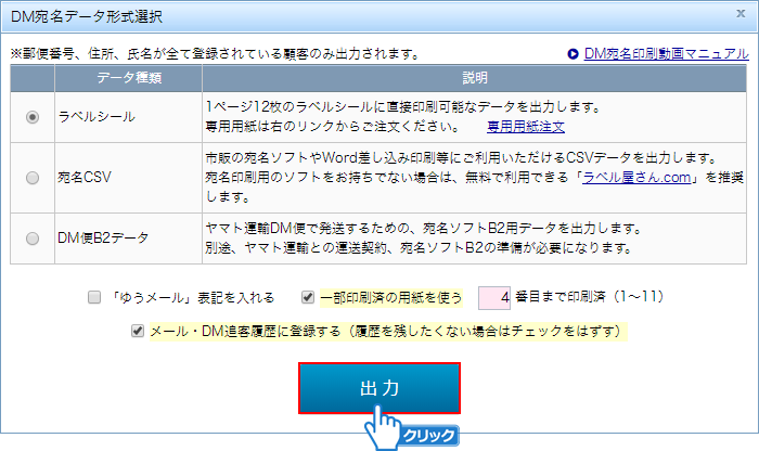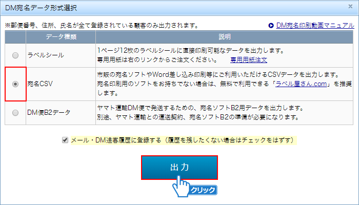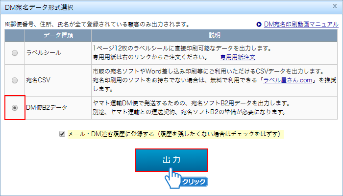 ①「DM便B2データ」にチェックを付け、「出力」ボタンをクリックしてください。