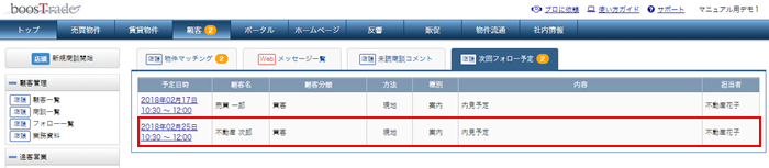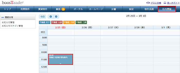 顧客への物件紹介やお電話など、スケジュール登録しておく事で漏れを防ぐことができ、更に社内情報メニューのカレンダーにも掲載可能ですので、