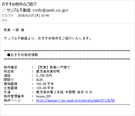 メールには、物件詳細のURLが自動的に差し込まれ、物件の詳細は、インターネットで簡単に確認できます。