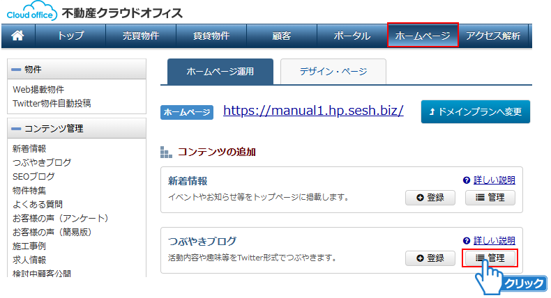 つぶやきブログ記事を作成しましたら、ホームページのナビゲーションやメイン領域、またはサイドバーに表示してください。