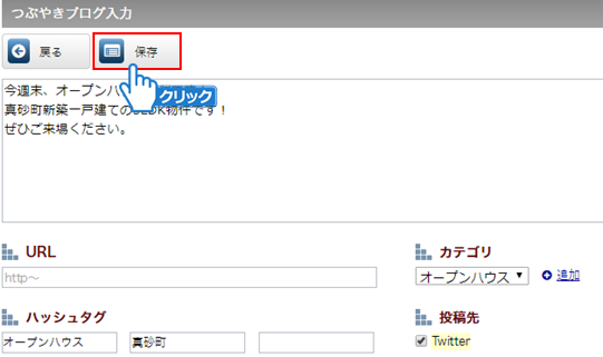 Twitter(X)から記事を削除したい場合は、つぶやきブログ入力画面のTwitterチェックを外して「保存」すると