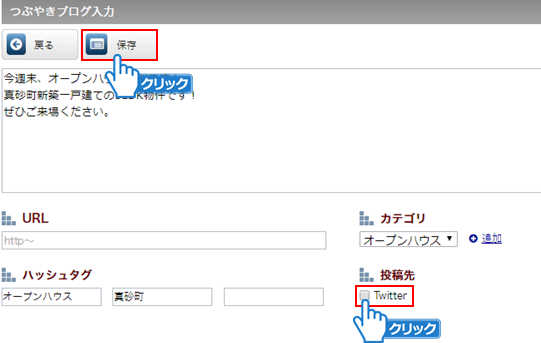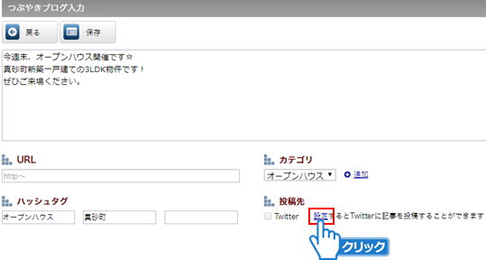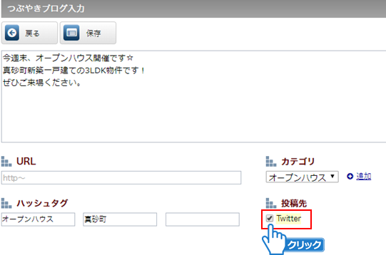 ①つぶやきブログ入力画面で「Twitter」にチェックを付けてください。
