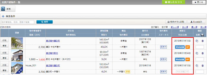 「Web店舗」、「HP」がそれぞれ色が付いている時はWeb公開されていることを表します。