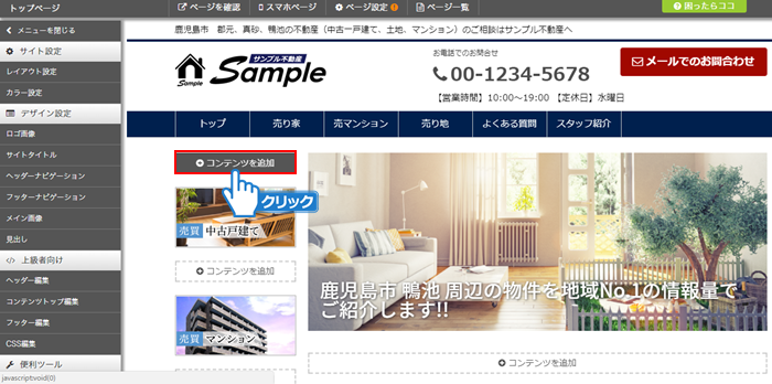 メイン領域の「コンテンツを追加」の文字の上にマウスを乗せると、