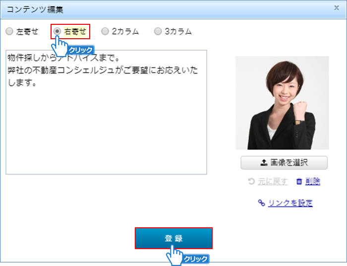 ①「右寄せ」にチェックを付け、「登録」ボタンをクリックしてください。