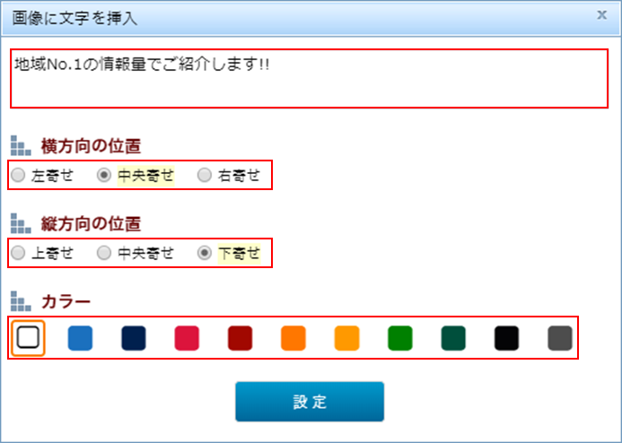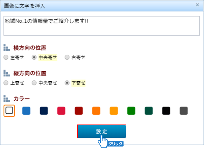 ②挿入する文字の入力をし、文字の位置やカラーを選択してください。