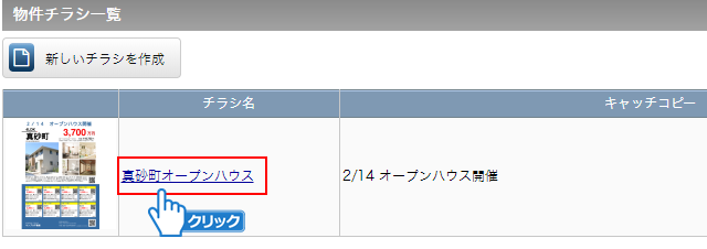 ②物件チラシ一覧から、QRコードを発行するチラシ名をクリックしてください。