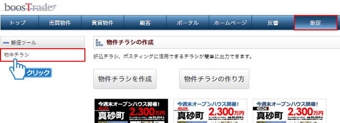 ①「販促」メニューの「物件チラシ」をクリックしてください。