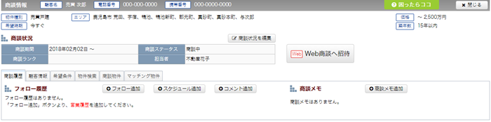 対面接客での新規商談登録は、名前だけ最低限登録して商談登録したい機能として「新規商談開始」ボタンからご登録ください。